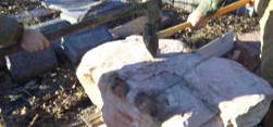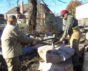 Stone splitter used on Colorado Red Sandstone. Repeated swings with the sledge hammer against the splitter as it moves along a line will split the boulder into two pieces.These sandstone boulders are used for signs and memorial use by Kling Memorials/Butler Monument Company, Butler, Mo whose employees split them to size.