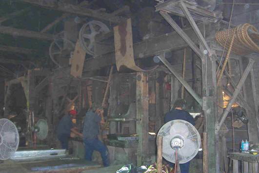 Two dies were made of each design. The “female” half was set in a cast iron bed and the “male” half was fastened to a cast iron hammer hung above the bed.